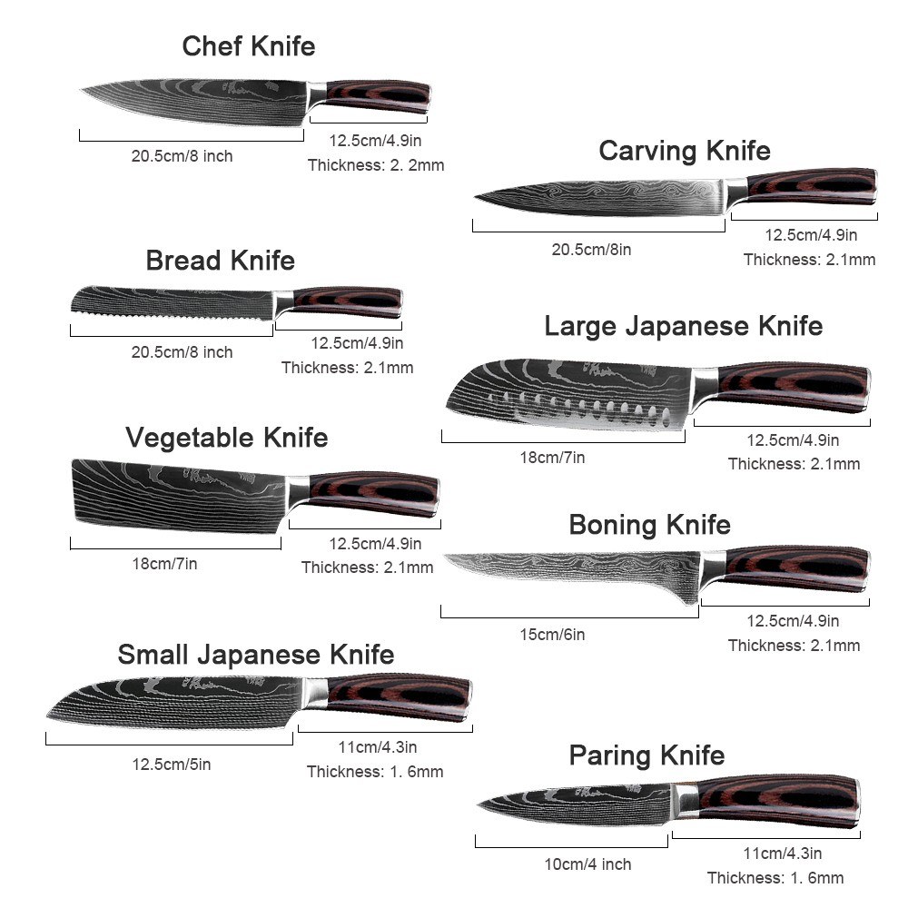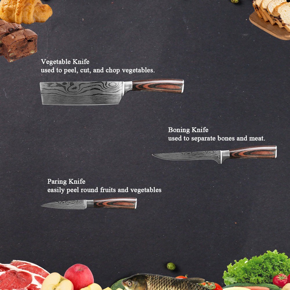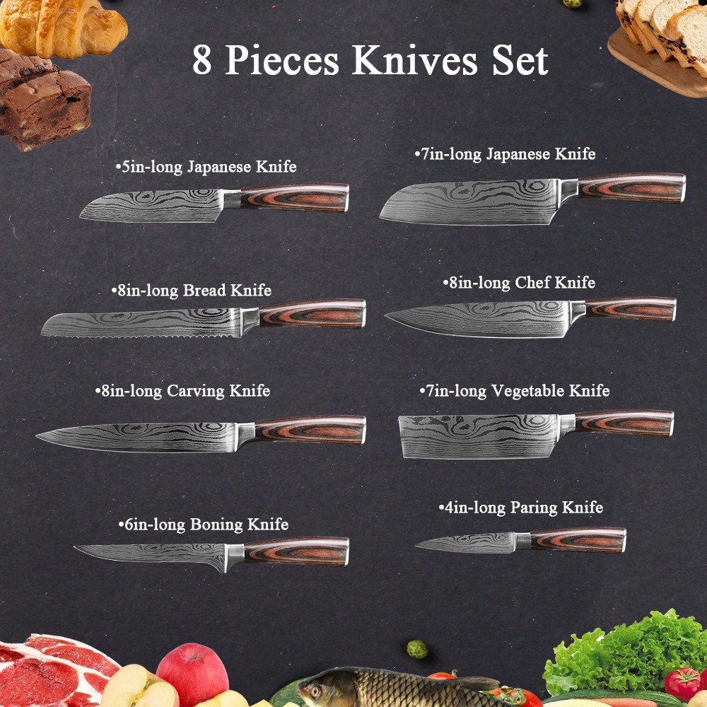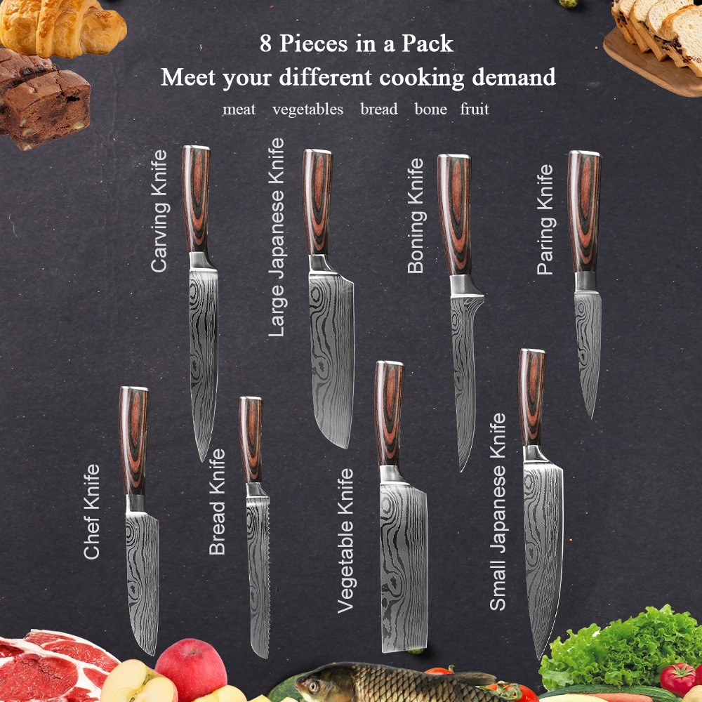 • SET DI COLTELLI MULTIUSO: set di coltelli da 8 pezzi comprendente coltello da chef, coltello da trinciante, coltello da pane, coltello giapponese grande, coltello da verdura, coltello per disossare, coltello giapponese piccolo e spelucchino. Che si tratti di tagliare carne, affettare verdure, disossare, sbucciare o affettare il pane, possiamo soddisfare le vostre esigenze.